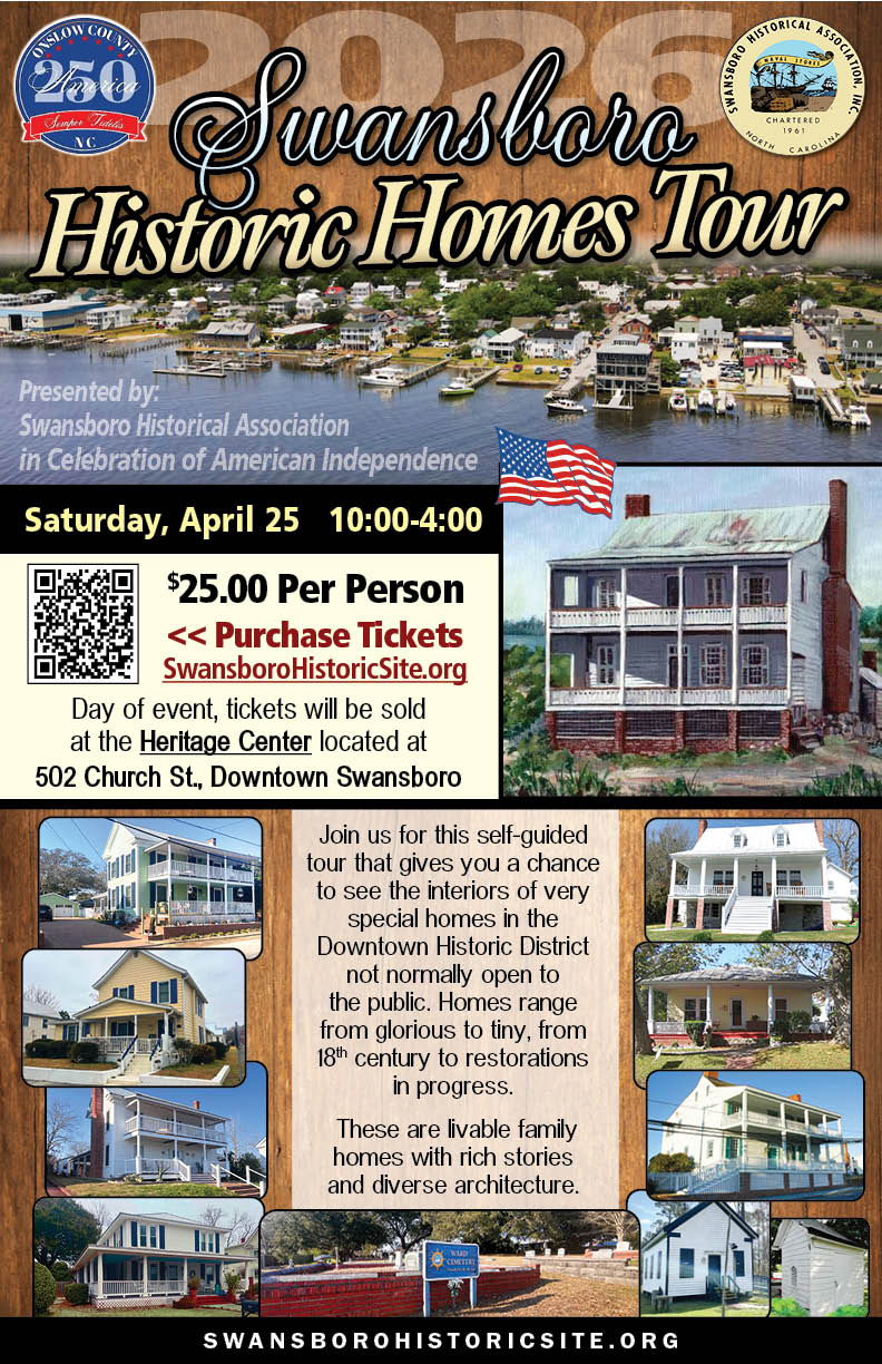 Celebrate 250 years of American Independence with the Swansboro Historical Association’s Historic Homes Tour—hosted in cooperation with the Town of Swansboro as part of Onslow County’s America 250 celebration. Tickets and more details here.