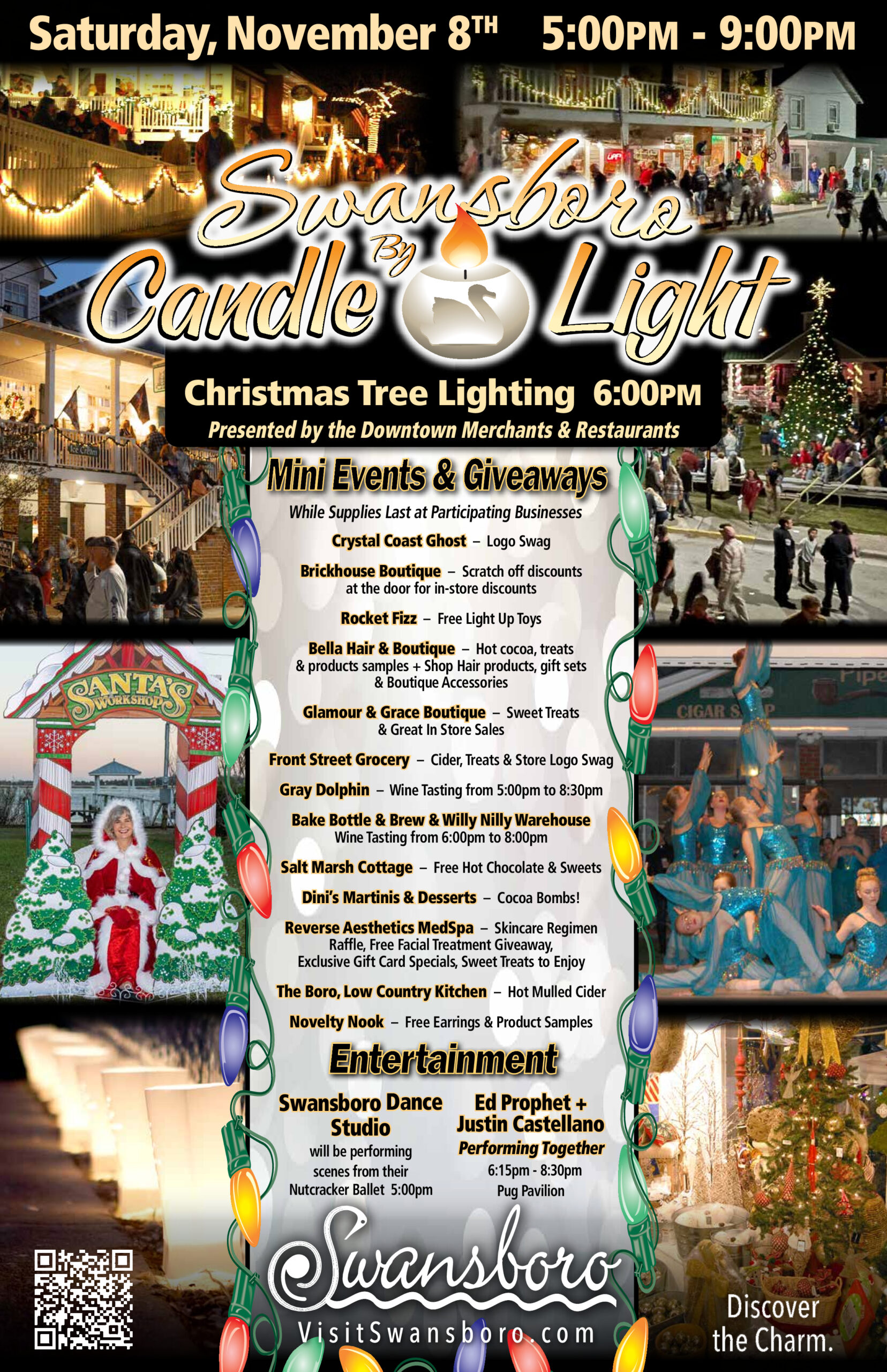 Step into the glow of the season in Historic Downtown Swansboro as the streets come alive for our Annual Swansboro by Candlelight. On this magical November evening, stroll beneath twinkling lights and the soft shimmer of luminaries, admire whimsical holiday window displays, and enjoy the charming ribbons, bows, and details that bring back the nostalgia of holidays past.