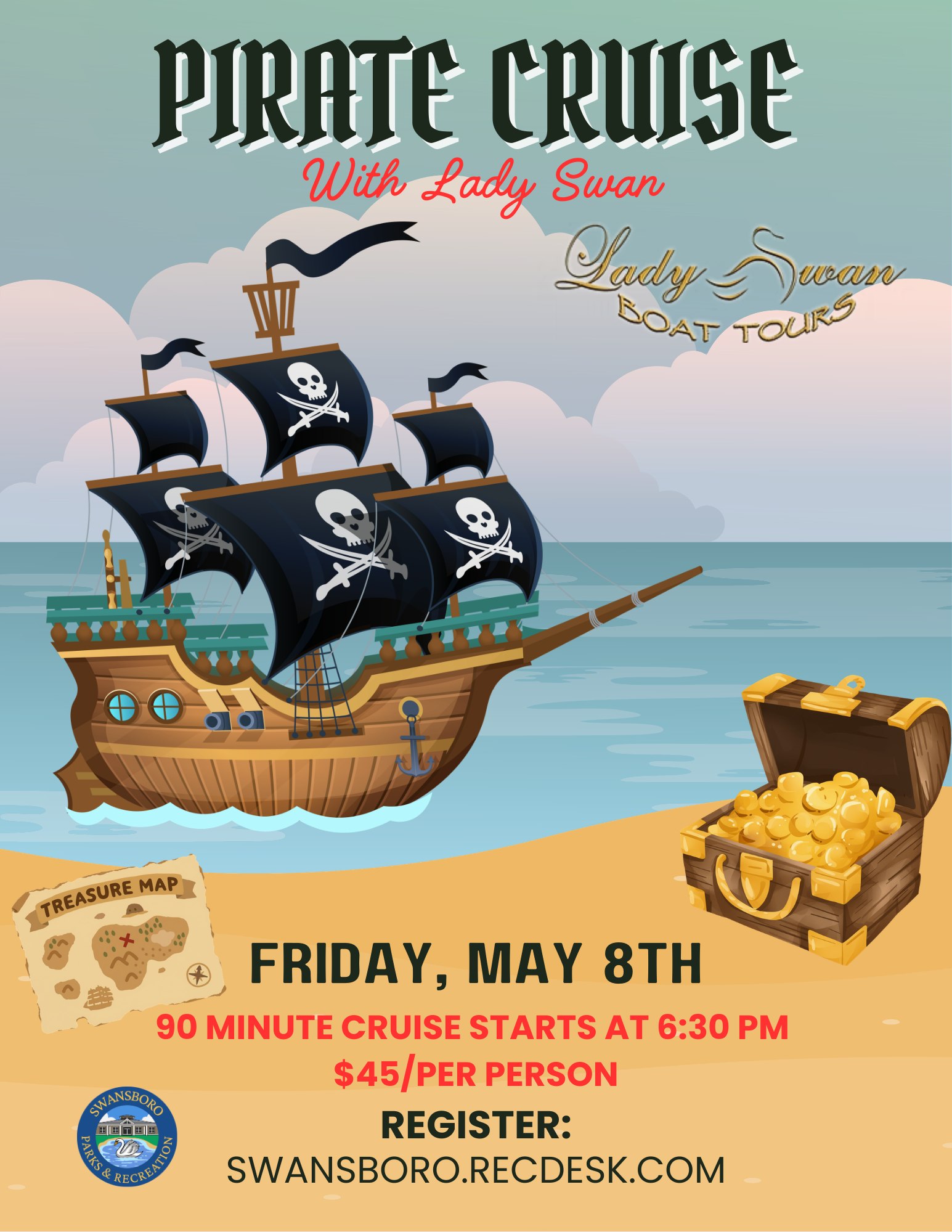 Join us on Friday, May 8th at 6:30 PM aboard the Lady Swan for a 90-minute Pirate Cruise through the scenic Swansboro waters!